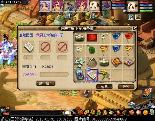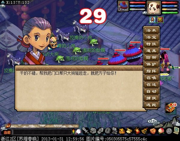 大娘让你驱狗,主怪是ST,变身开飞机,小狗ST,WZ,一般物理攻击的比较多,围观的蛤蟆NR,WZ,DT各种门派,蛤蟆血相对小狗老说,多一点。木有难度,战斗胜利获得王大娘的方子,别急,要把方子交给豆蔻才能。这一环最后都是要返回豆蔻处交任务的,千万注意了。