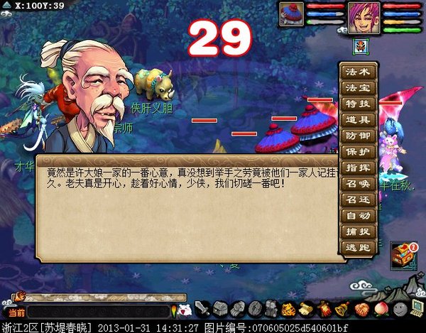 找到许大娘后,回复海老先生,切入战斗,侠肝义胆是LG,会龙吟,炎魔神是DT,其他未知都有可能。 战斗2回合搞定。