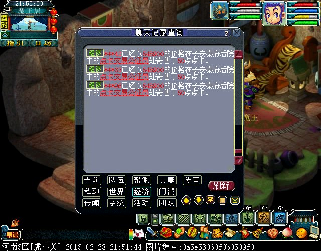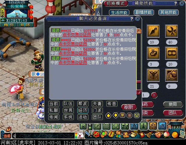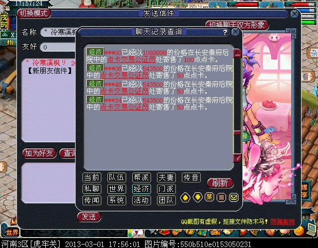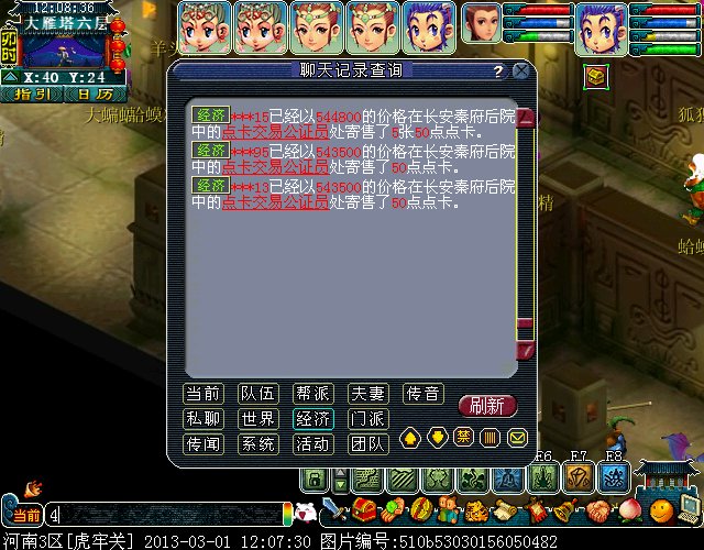 最近我们区出现了一批神秘的卖 游戏内寄售点卡的人~只卖50点的~~每次上架的时候在秦府看不见人,3-4个ID(一般是3个ID一起前后不差1秒)一个ID寄售一张50点的 上的价格一样 目前价格是543500 (偶尔会根据市场价格波动下)