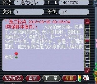 追忆似水流年一个帮派里面的玩家,不小心在丢商人奖励的时候,把高级必杀丢了进去。结果帮主非常有人情味的处理该事件。这样的帮派和帮主才叫真的和谐且有人情味。