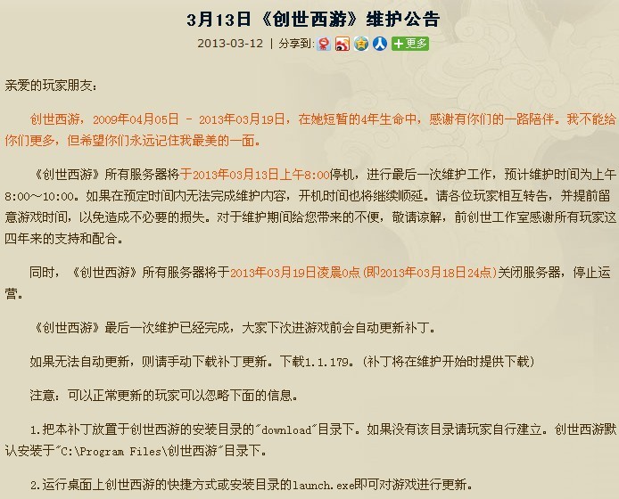 这是一则创世西游的更新维护公告。想必很多玩家都已经知道,这款游戏早在1年前就发布了停止运营的公告了。这一次的维护也是这款游戏的最后一次维护。从文中可以看出,哪怕是最后的一次维护,官方依然放出了客户端的升级补丁。