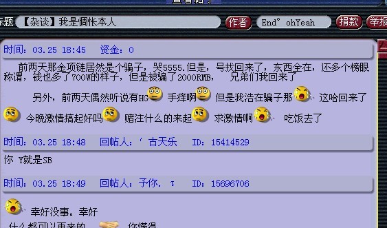 现在这个89的DT说骗我朋友1W5的不是他本人。他自己也被骗了。我想说,他自己一个号被骗了怎么这么安静??!!一点消息都木有???难道他价值5W以上的号被骗他可以这么冷静的找客服找回??为什么没发任何帖子???真逗,到底是不是他自己在演戏,装作被骗号,再做骗子骗了人,又说本人回来了我们谁也不能断定。还有我朋友要他发被骗号的时候找回记录,他只发了今天的??你号被骗了。你之前没有找回的记录??只有今天的??可笑!!