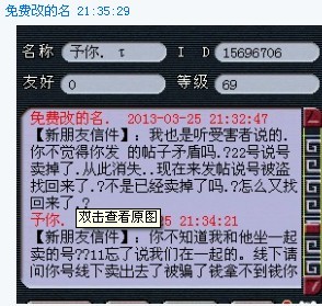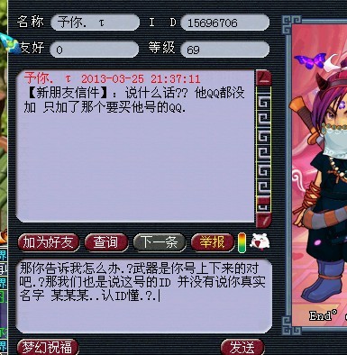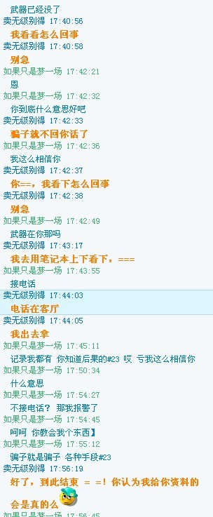 我问他,这个人你认识?他说不认识,只是聊了一下,不过对方愿意先武器,后钱。。我更觉得事情不太妙,所以我对他说:梦幻交易物品3天后无法找回。叫他小心一点。所以我朋友在22号的晚上10点给卖家打了5000快。然后拿到了武器。他创建了个19J的小号拿了大黄刀砍了69的在我面前得瑟。上图为证: