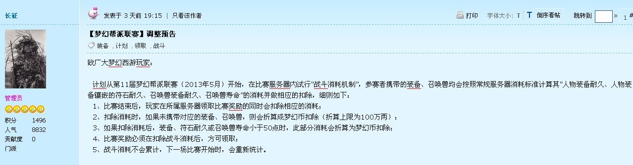 计划从第11届梦幻帮派联赛(2013年5月)开始,在比赛服务器内试行“战斗消耗机制”,参赛者携带的装备、召唤兽均会按照常规服务器消耗标准计算其“人物装备耐久、人物装备镶嵌的符石耐久、召唤兽装备耐久、召唤兽寿命”的消耗并做相应的扣除,细则如下: