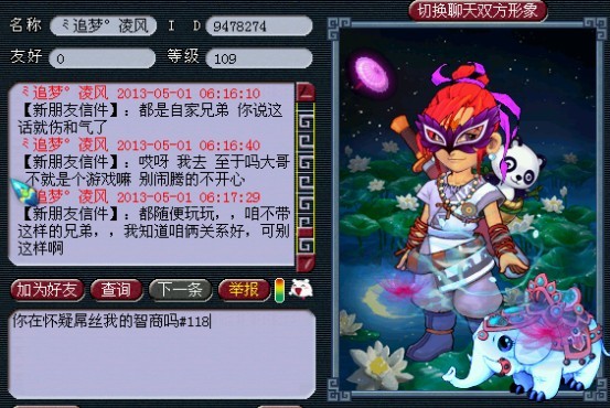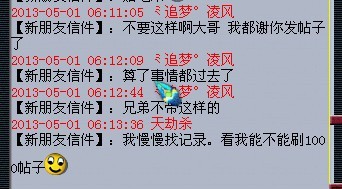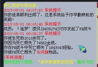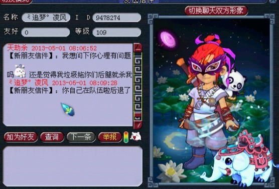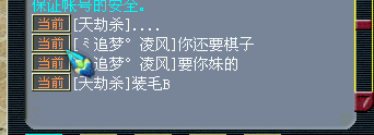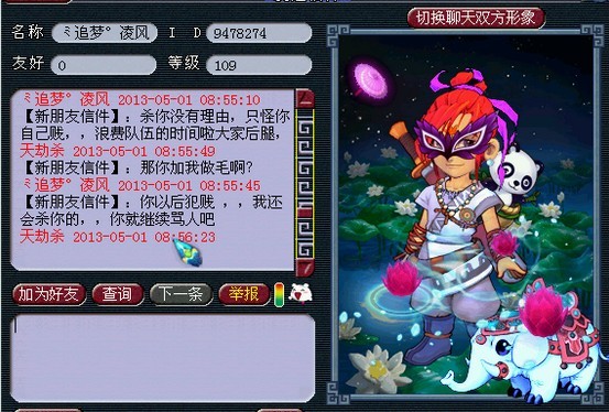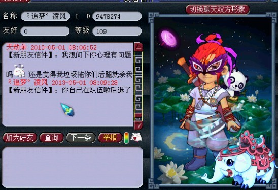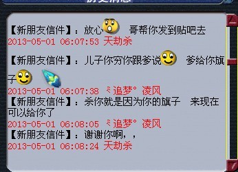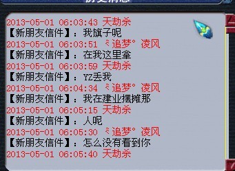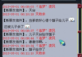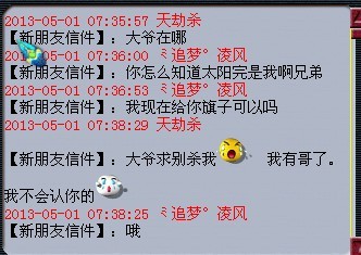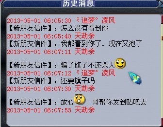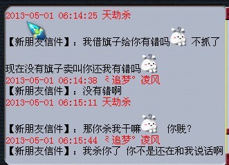 抓到还有10分钟队长说不抓了。散了队伍,我就喊队长还我旗子。队长叫我去建业(*丝心比较善没想什么)。露珠屁颠颠的来到建业没有看见队长。就问了下他。他说没有看见我。露珠跟交易了他。被他取消交易后露珠以为没什么。谁知道接着露珠被点。露珠还不到怎么回事,露珠就防御BB保护自己。谁知道队长大爷来句“你还敢要旗子”。接着被扫了。然后去见了传说中的小白。