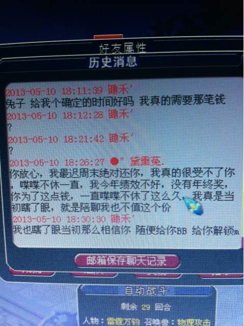 听她朋友说15号她就转区了 没见过这样欺负人的 给你解锁码自己上号拿BB玩 再到便宜买了我的宝宝 你没钱 我还给你分期付款 给你拖欠快4个月 够意思了吧 最后你就给我这样的回报?