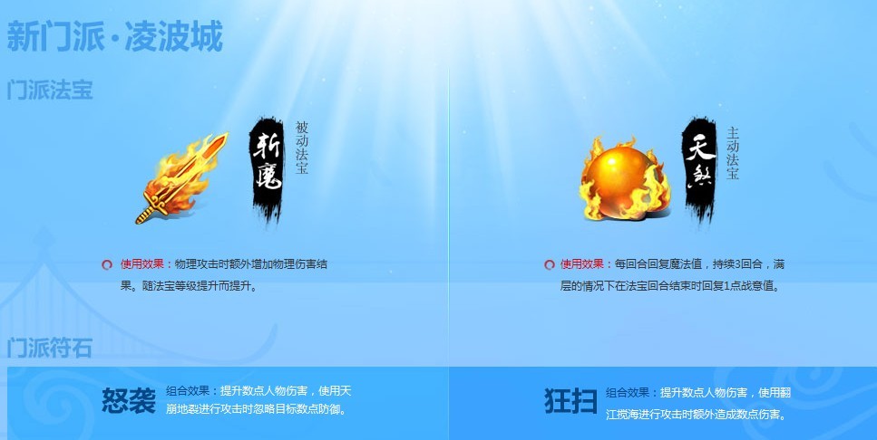 | 武神显圣 | 凌波城弟子可召唤上古神勇之力助战,其英豪勇武之气,可驱策风云,震慑三界妖异。 | 无 | 碎星诀 | 武神之力万钧,可碎银河之星辰。 功效:使自身或者队友进行物理攻击时的物理伤害结果临时提升。 |