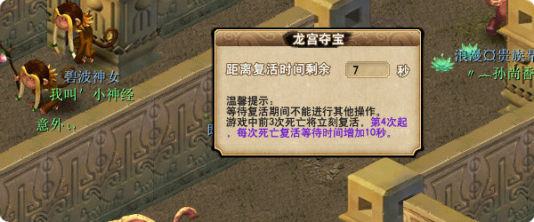 但是如果你在怪的围殴下,基本超不过2S,所以强烈不建议去开怪物下的宝箱。而死亡前三次可以立即复活,复活点为出生点,从第四次开始复活需要10/20/30...的时间,所以越到后期复活时间越长