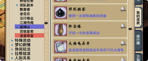 进行1/20/100次各1点、获得宝箱技能并使用,5个技能各一点、开启一次珍宝塔(暂时不明获得方法)2点成就,大海龟、龟丞相、龙龟各杀死10次,各1点成就。
