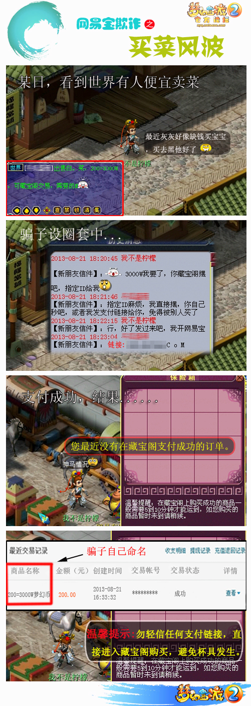 网易宝欺诈真实案例 近期发现不少骗子利用网易宝支付,修改商品名称,导致玩家被骗,交易过程已简化,还请大家留意