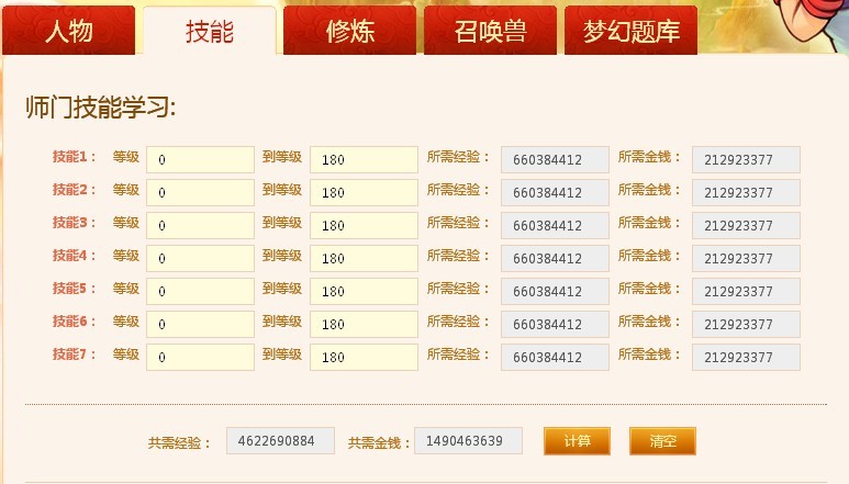7个技能从0-180需要的总经验是4622690884(46亿),需要的金钱是1490463639(约15亿),算上之前的升级经验,现在一共是140亿经验,15亿金钱。