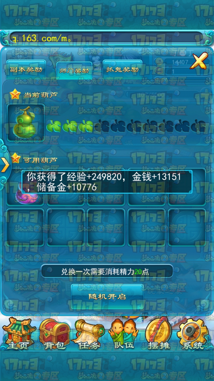 紫葫芦必得东西,金葫芦大几率得到东西。小编选择做完2轮师门,因为2轮师门可以得到18点门派贡献。如果PC端你也做了师门,那么相当于双倍门贡哦。