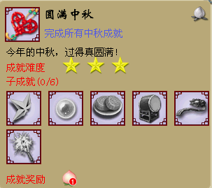 最后介绍下本次活动的成就,共有7个成就,其中前面6个小成就完成后无成就点获得,完成难度低,全部完成后触发“圆满中秋”成就,可获得一点成就点
