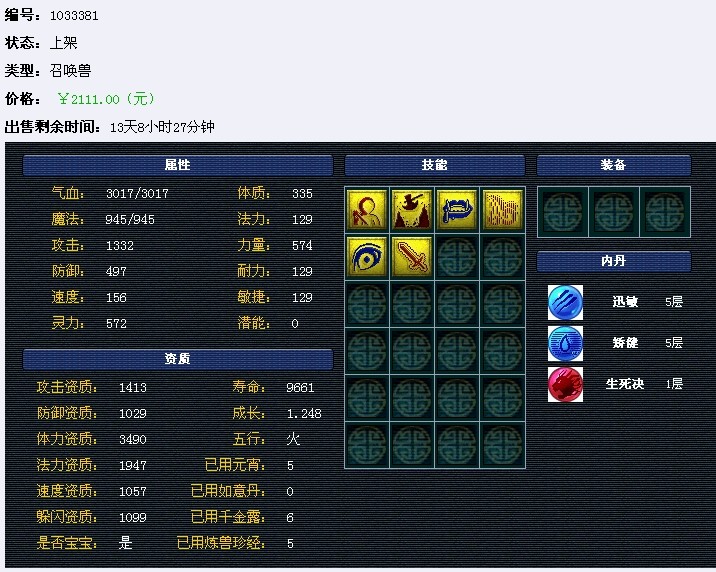 灵符女娲,低法波的价值严重影响了这只宝宝,如果需要使用还需要继续打书,考虑到原有的技能和胚子的因素,这么一只宝宝的价值大约在400R-500R之间。