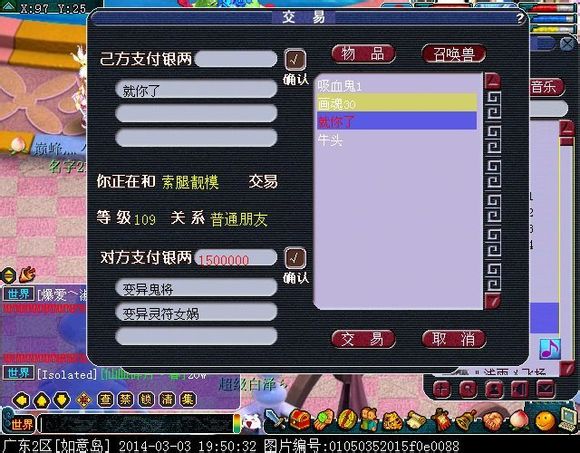 这位玩家想要用两只宝宝进行交换,鬼将满内丹,碎甲刃,50伤害高偷套子。