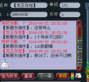 昨晚下午6点50分 本*在驿站喊15W请人杀120剧情云里雾 包不死的来 喊了没多久一个171渡劫大神LG上车了 本*私聊他说一个号? 他说修25杀不过? 我说只要包不死随便你怎么杀就这样的去了
