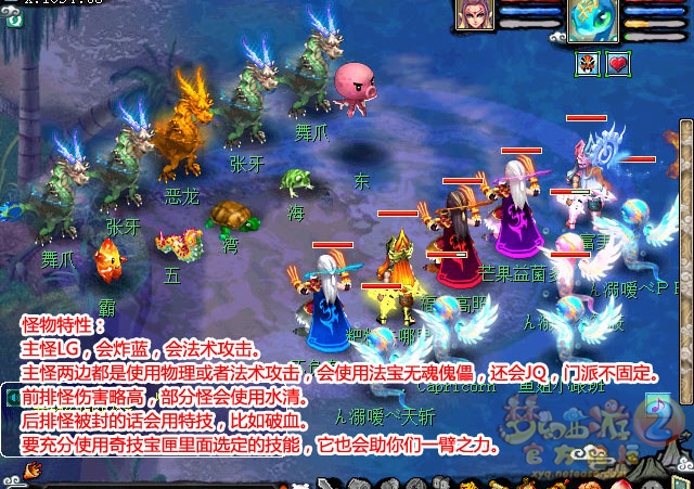 Boss恶龙这一关,说难也不难,主要是看技巧。先看主怪恶龙是LG门派,时不时会给你来个炸蓝,法术攻击神马的,然后又会给你来个无魂傀儡……所以,老路强烈建议队伍里至少1~2位队员佩戴法宝七宝玲珑灯。主怪两边的四个怪也不能小看,他们既会用大特技,又会用常用法宝,更要命的是,这四个怪会配合主怪对我们来个狂轰滥炸,所以大特技JQ,罗汉等都是必须的。 前排东海湾五霸个个都会用水清,五霸被封住了会自己水清,门派和主怪旁边四个怪一样是随机的,难度不高,可以轻松解决。