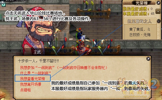 一战到底,顾名思义,就看你能和NPC战斗到第几关,对面NPC名称都是门派+大写汉字,如门派一样,出来的NPC是什么门派,使用技能就是什么门派的。
