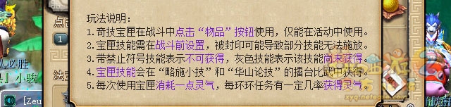 1、该道具在环式任务里战斗使用会消耗一点灵气,每次战斗结束会会有一定的几率获得一点灵气为宝匣“充值”,在华山论技活动里使用宝匣不消耗灵气,也就是说无限使用宝匣里面的技能。
