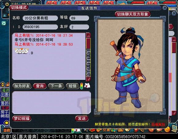 事情是这样,在网上看到个消息,女玩家秒号空降我区,就互加了好友,然后一起刷副本活动什么的,然后她把她的号给我了,叫我帮她上号跑商什么的,我想女孩子不会玩就帮她跑了,接下来的事就有点不对劲了,又是给我发照片,又是加我微信什么的,先是跟我借钱买BB,2000W,我说你把卖家的ID告诉我,我没有那么多钱,我把我BB押他那,然后我和卖家谈了,卖家也同意了,我把BB交易给她说这是我拿自己的BB抵押的,希望你有钱了就给人家,我好把我的BB赎回来,她说没问题,给我留了电话,我打通了,确实是她就想应该没问题了。