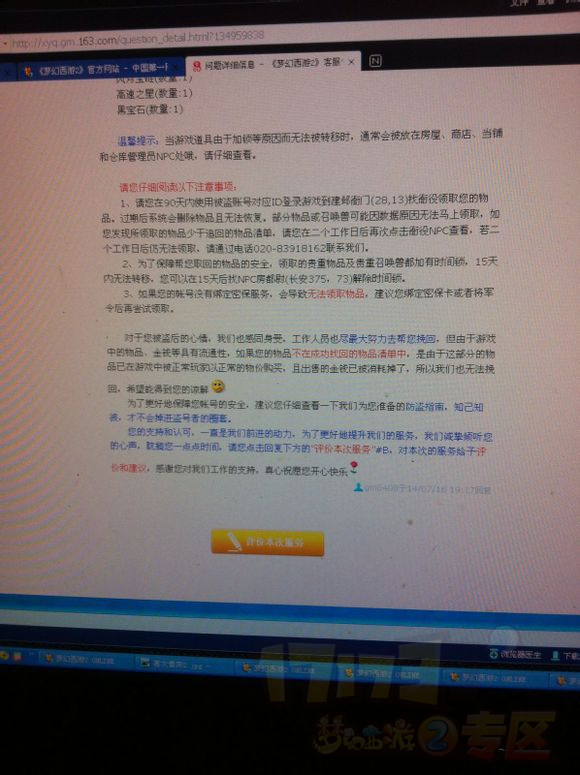 就在今天中午,楼主正在上班,她给我打电话说,买号的钱她凑的差不多了还差300,问我能不能借她,我说我上班呢,回家再说吧,然后她就跟我说她把以前的号东西都卖了,想借我的号上去玩会,我心想上次人家都能信任的把号交给我,我一个大男人不能那么小气不借啊,我就把号给她了,然后她又想上我的109方寸号,我也给了,之后我还上微信问她打了多少图了,她说都挖了,我也没多想,就工作了,等到我下班合计她应该下了,就上号了,一上号我傻了,锦衣祥瑞全没有了,号上的装备也全扒了,回家看看仓库,一点车夫才知道,我的豪宅也没有了。