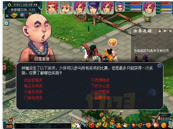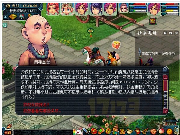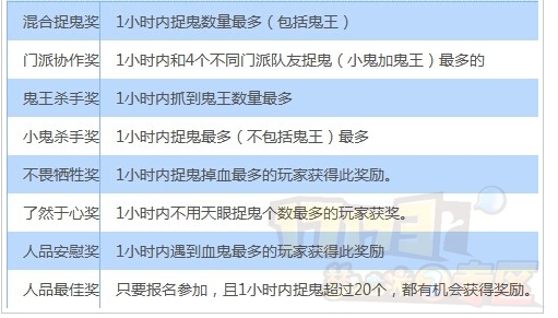 三界少侠可以到长安(240,113)找目莲高僧报名。报名之后的一小时内捉鬼最多的玩家可以获得钟馗提供的奖励。同时钟馗还设立了不同奖项,供表现出色的少侠争取。
