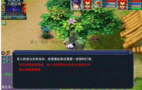 注意事项∶康乃馨种子,活动开始后≥30玩家上线自动获得。每人只有1次的种植机会。系统会在第5分钟和第10分钟提示玩家照顾。成熟后给予门派师傅即可。