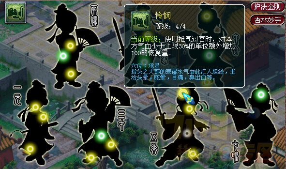 杏林系:武器伤害8%+金刚伏魔技能*20%+(队员气血低于30%时+100)。