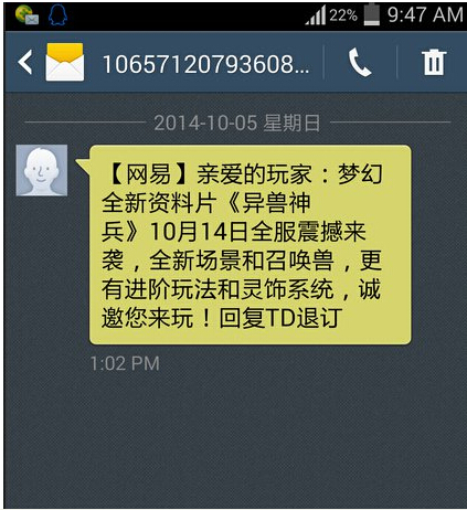 号外!号外!玩家曝光新资料片全服放出的时间,玩家收到的网易短信,新资料片《异兽奇兵》放出时间为:2014年10月14日。