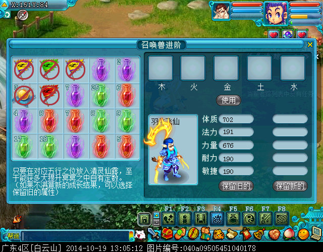第五,110灵性隐藏任务.这个没什么说的,你需要什么属性就把对应的属性上面放高灵气的仙露,不需要的就放稍垃圾的仙露,宝宝5项属性对应的五行同如意丹.体质=木,魔力=火,力量=金,耐力=土,敏捷=水.