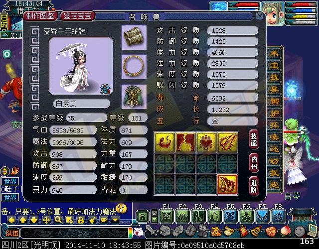 带的高驱套装。。白板的。。技能也是任务技能。。木有吃真经元宵。。本来想洗1.244.。但是难得遇到这么好的防和法Z共存。。保留了。。