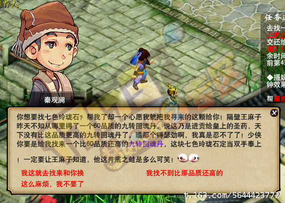 建邺城的任务也非常简单,NPC会随机要你一个超过60品三药(不知道其他级别要的品质是不是不一样,反正89是要60品以上的),然后如果你拿到这个三药的话他会给你双倍奖励,如果没有的话,你可以选择打怪获得七色玲珑石(但只能获得单倍奖励),怪物难度不高,主怪是MW、LG中随机一个,左一混沌球一速抽蓝(抽DT的蓝非常多,不过我是DT我不用蓝)右边金色老龙随机门派(我一般遇到的事NE、PS、MW、LG、FC),建议如果本区三药便宜的话可以考虑拿双倍奖励,如果三药价格昂贵,或者他向你要大金的话你还是打怪吧,得不偿失啊
