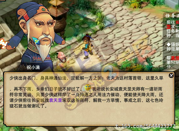 这个任务难度不大,找到NPC后用飞行符飞到天台,找袁天罡要一张祈雨符,到指定位置下雨,切入战斗。难度不大,主怪固定是MW,火伤不高;两边小怪门派随机(我遇到过WZ、MW、NE、FC、PS),战斗完成即可获得经验、金钱、随机一个七色玲珑石