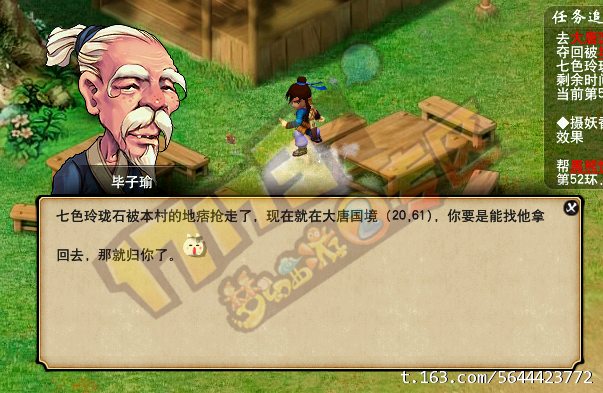 这个任务难度也挺小,找到NPC后,NPC会提示你有个地痞抢走七色玲珑石跑到(XX,XX)处了,你跑过去收拾他就能获得经验、金钱和一个七色玲珑石。难度不大,主怪一般是PT(渡劫角色模样,其中有我们最爱的剑侠客……不许你这么玷污我们剑侠客!左一猫灵固定莲台PT,为啥这么说?这家伙第一回合会给主怪加个波澜……渡劫大神就是猛啊,右一蝴蝶随机门派,(我遇到过TG)会小法,伤害不高。莲台PT第二回合自己会跑的,所以不用管它。