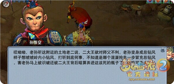 在瓶子里,孙悟空告知原来二大王他们欲对唐僧不利,于是他就冒充总钻风,结果被人提前一步冒充了(原来是我的错),现在要帮助孙悟空一起把瓶子弄破。这里的任务还是比较简单的,一步步根据孙悟空的提示完成就可以了,千万不要自己去乱打哦,从瓶子里出来后获得150000经验。
