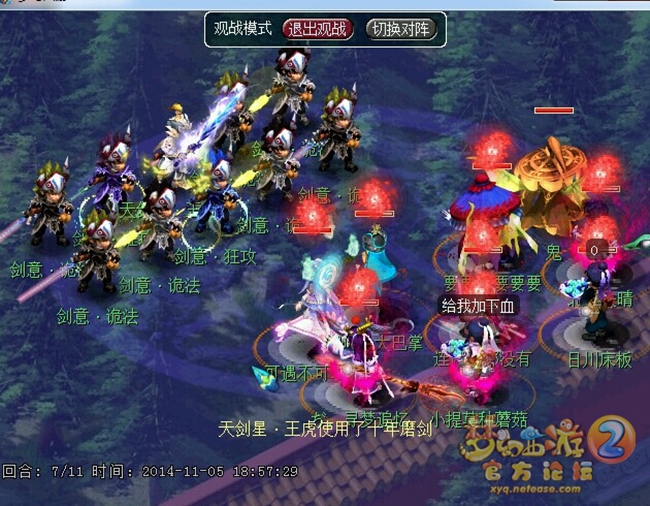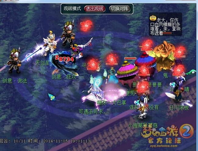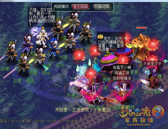下面我就直接切入正题了,说下具体的杀法:切入战斗后,直接起状态,BB点杀主,直到主怪召唤满10个怪,并且说出如下图的一句话:“不错,你们坚持到了最后一关,让我们来一场酣畅淋漓的对攻吧!”这个时候,可以击杀小怪咯。 此时主怪会用一个大招——千里留行打掉人物或召唤兽80%的当前气血而后休息一回合。