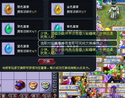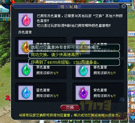 就会出现该界面。但是失败了(对方身上没有秘籍或者已经获得了改种颜色的验货)。这个界面就会关掉!!!然后我重新打开任务栏,重新右键点击烟火秘籍,重新选择一个玩家。越到后面越不好选,重复的可能性就越大,。然后我就在无限的痛苦中找到了GM。当时没有截图,又是31号的夜里,用了很多文字才让值班的GM把这个问题彻底理解。