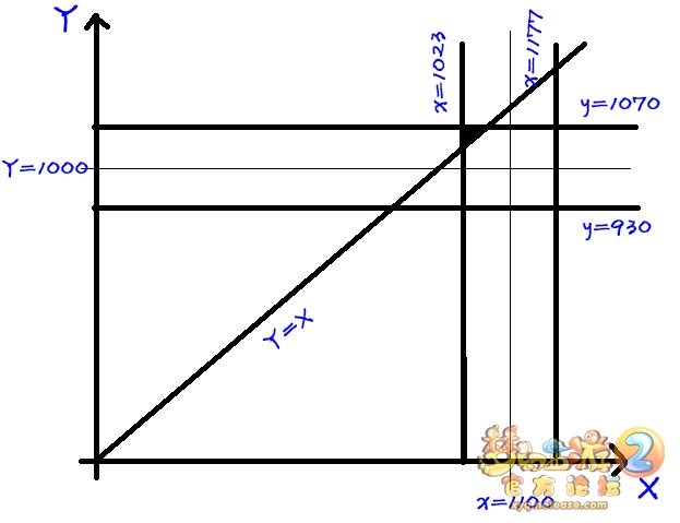 在这个规则下,乱敏几率如何呢?假设玩家X速度为1100,玩家Y速度为1000,Y比X先出手的几率为多大呢?我们用面积法计算一下。